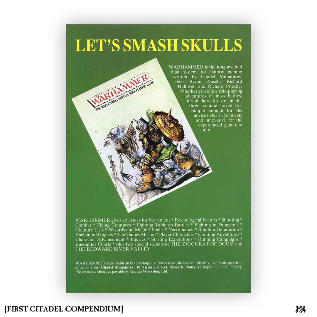 The first edition of Warhammer was a deceptively simple affair: a boxed set with a dramatic skeleton-smashing warrior emblazoned upon it that contained three booklets of typed rules with which players could run an underwhelming roleplaying game or a thrilling fantasy wargame. Drawing on the success of Dungeons & Dragons, the fantasy worlds of Tolkien, folklore, and mythology, and the tried & true mechanics of historical wargaming the fledgling product from the Citadel Miniatures team at Games Workshop laid the foundation for spectacular legacy that would change not just the gaming table, but the entire world.